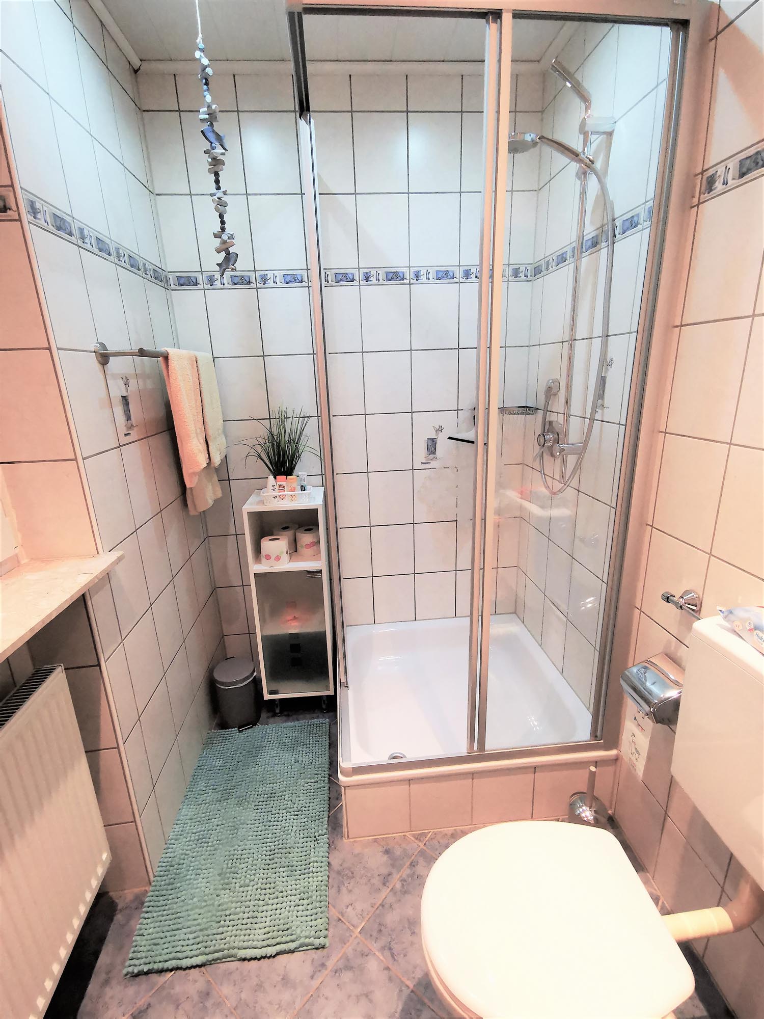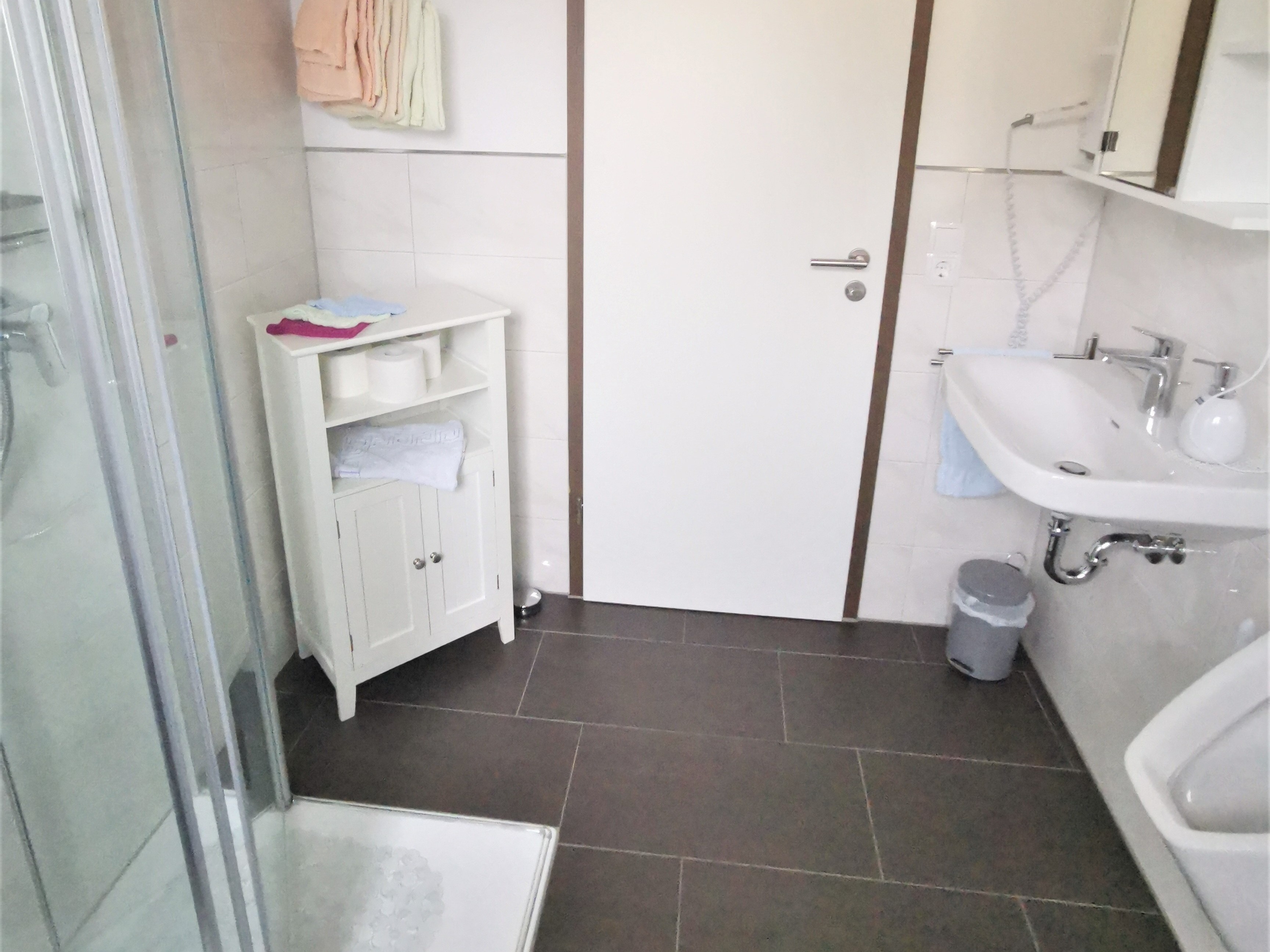 befindet sich im Erdgeschoss und enthält Dusche, Toilette, Waschbecken, Spiegelschrank und Föhn.