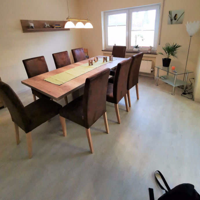 mit großem Tisch für bis zu 8 Personen. Hier sitzen Sie bequem zum Essen und zum gemütlichen Beisammen sein. Im großen Vitrinen-Schrank finden Sie Gläser zum Essen und Gesellschaftsspiele für einen gemütlichen Abend mit Familie oder Freunden.