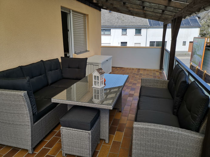mit einer große Rattan-Sitzgruppe für 8 Personen.