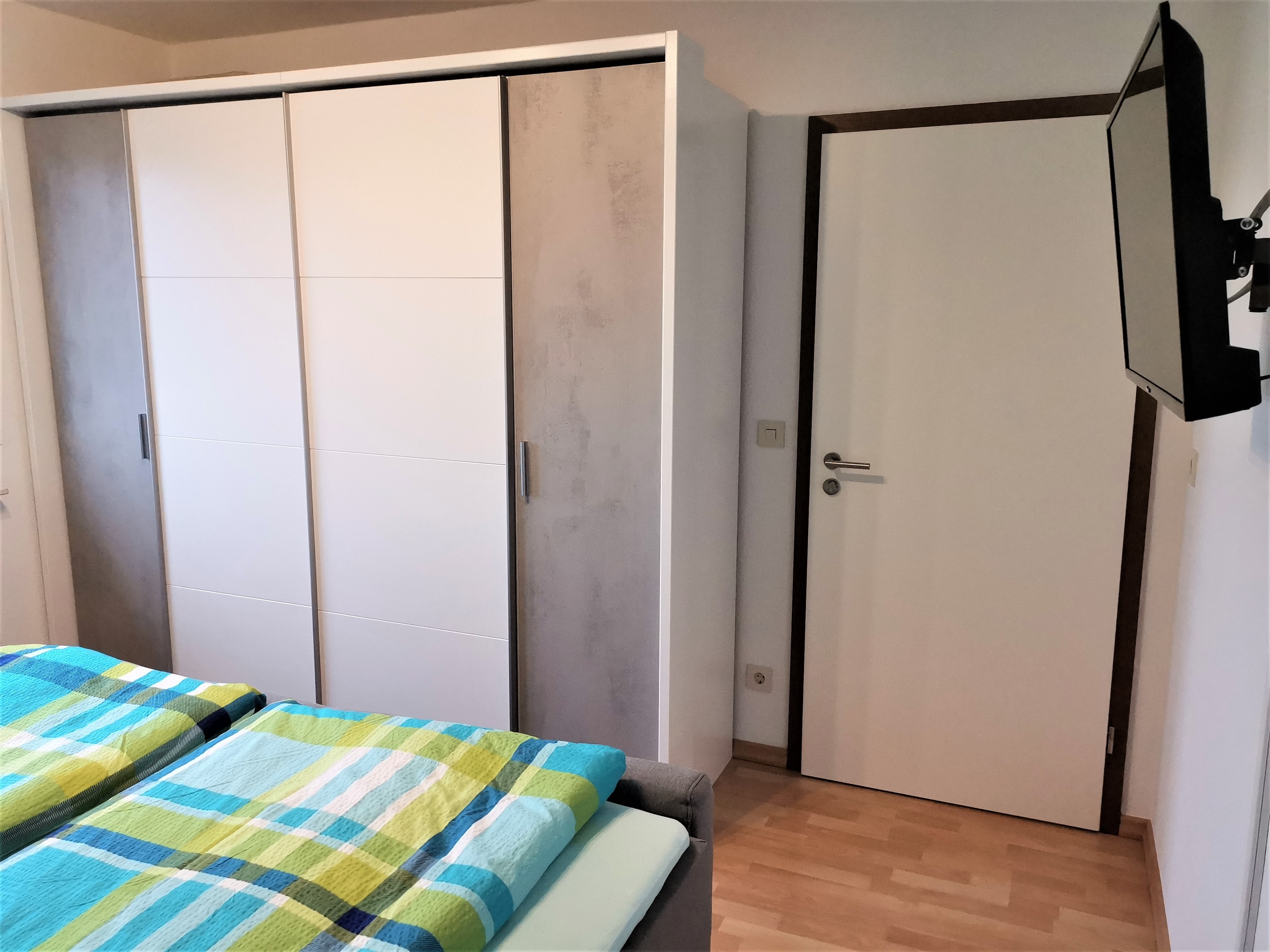 mit Polsterbett, Kleiderschrank und Fernseher, sowie Zugang zum Balkon.