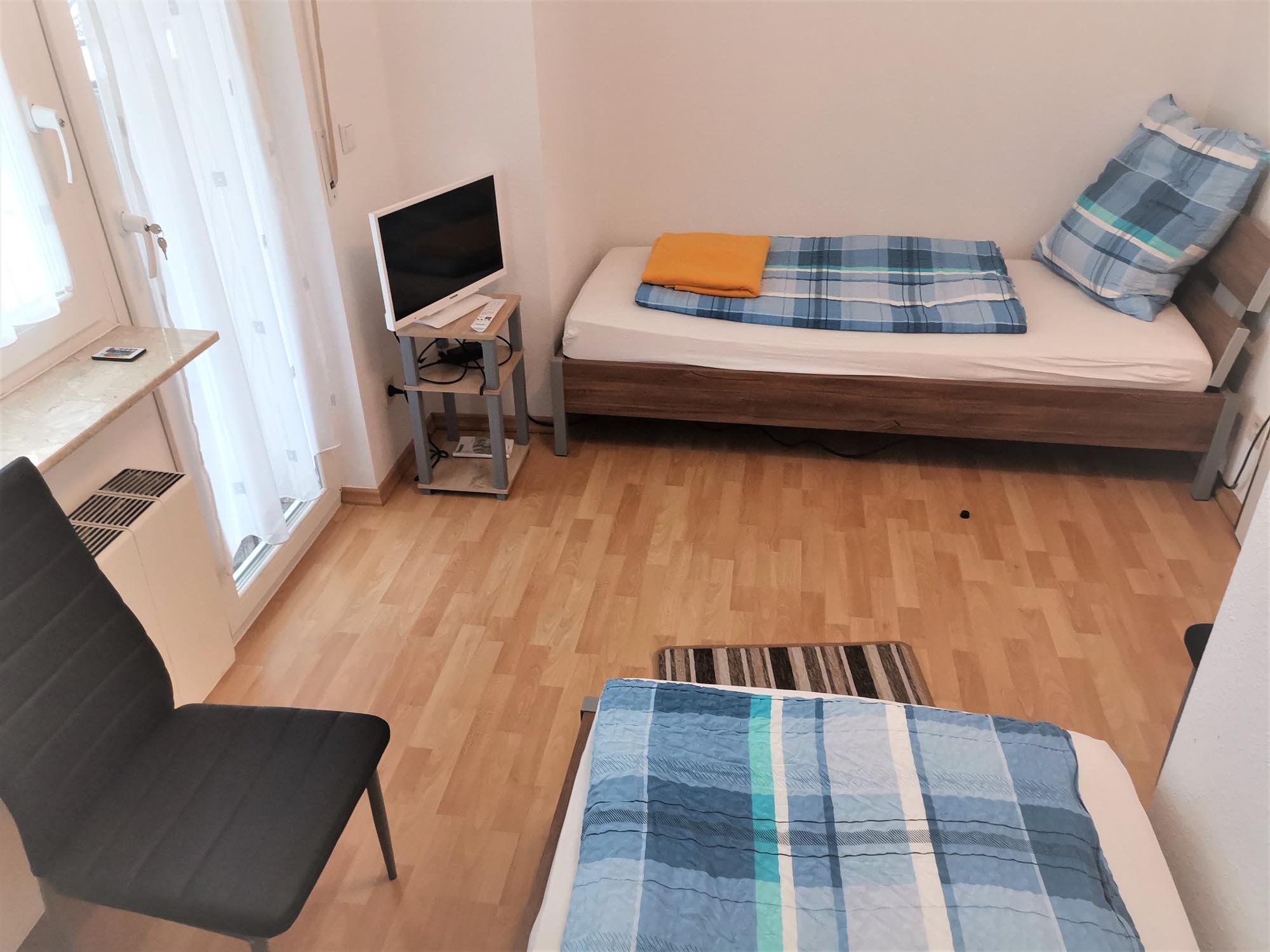mit zwei Einzelbetten, Kleiderschrank, Fernseher und Zugang zum Balkon.