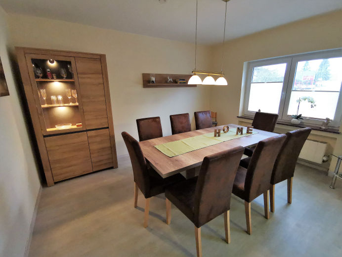 im Esszimmer mit großem Tisch und Platz für bis zu 8 Personen.